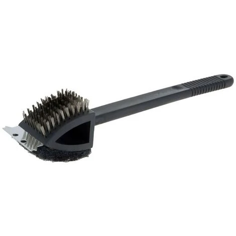 CON FILI PER ABRASIONE IN ACCIAIO, SPUGNA PER PULIZIA E LAMA FRONTALE PER RIMOZIONE RESIDUI. ADATTA PER INCROSTAZIONI E RESIDUI SU GRIGLIE E BARBECUE.CM. 8 X 1,8 X 37