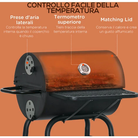 Goditi la grigliata perfetta con questo barbecue a carbonella Outsunny. Realizzato con robusto metallo rivestito con vernice resistente alle alte temperature, il BBQ è destinato a durare a lungo nel tempo. Il coperchio ti permette di mantenere una temperatura costante durante la cottura e puoi controllarla con il pratico termometro incorporato. La mensola frontale e quella inferiore ti aiutano a tenere a portata di mano carbonella, piatti e tanto altro. Inizia a grigliare da professionista!