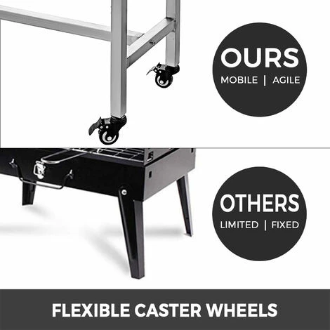2 tavolini offrono ampio spazio di lavoro o di preparazione, ottimo per posizionare materie prime, condimenti, utensili per grigliare, bevande, alimenti finiti, fazzoletti, ecc. Gli accessori durevoli consentono grigliate convenienti e veloci.